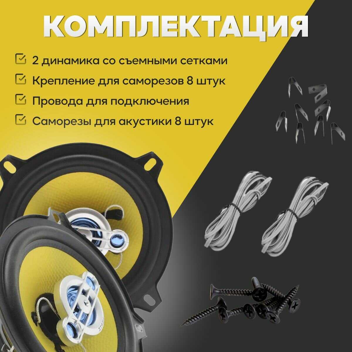 | Комплектация : | · Динамики 2 шт. · Защитные сетки 2 шт. · Провода для подключения · Крепления для саморезов 8 шт. · Саморезы для акустики 8 шт. |