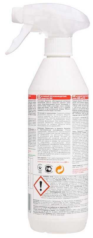 | Способ применения : | Нанесите средство на пятно и оставьте на несколько минут. Удалите средство салфеткой из ткани, которая хорошо впитывает влагу (например, фланель). При необходимости повторите обработку на сильно загрязненных участках. Во всех случаях перед применением протестируйте средство на незаметном участке поверхности. |