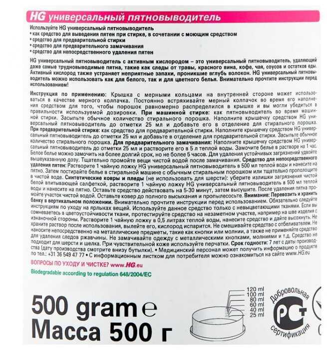 | Способ применения : | Крышка с мерными кольцами на внутренней стороне может использоваться в качестве мерного колпачка. Постоянно встряхивайте мерный колпачок во время его наполнения средством для того, чтобы порошок равномерно распределился в крышке и вы могли убедиться в правильности используемой дозировки. При машинной стирке: как пятновыводитель во время машинной стирки. Засыпьте обычное количество стирального порошка. Наполните крышечку средством HG универсальный пятновыводитель до отметки 25 мл и добавьте его в отделение для стирального порошка. При предварительной стирке: как средство для предварительной стирки. Наполните крышечку средством HG универсальный пятновыводитель до отметки 25 мл и добавьте в отделение для предварительной стирки. Засыпьте обычное количество стирального порошка. Для предварительного замачивания: Наполните крышечку средством HG универсальный пятновыводитель до отметки 25 мл и растворите его в 5 л теплой воды. Замочите белье в растворе на 1 час. Белое белье можно замочить на более долгий срок, но не более 5 часов. Для удаления устойчивых загрязнений удвойте вышеуказанную дозу. Тщательно промойте вещи чистой водой после замачивания. Средство для непосредственного удаления пятен: Растворите 1 чайную ложку HG универсальный пятновыводитель в 500 мл теплой воды и нанесите на пятно. Затем постирайте белье в стиральной машине с обычным стиральным порошком или тщательно прополощите в чистой воде. Синтетические ковры и пледы (не использовать для шерсти): уберите излишки загрязнения чистой белой впитывающей салфеткой, растворите 1 чайную ложку HG универсальный пятновыводитель в 500 мл теплой воды и нанесите на пятно. Оставьте средство действовать на 5-30 минут, затем высушите. После удаления пятна промойте участок чистой водой. Оставьте ковер до полного высыхания и пропылесосьте. |