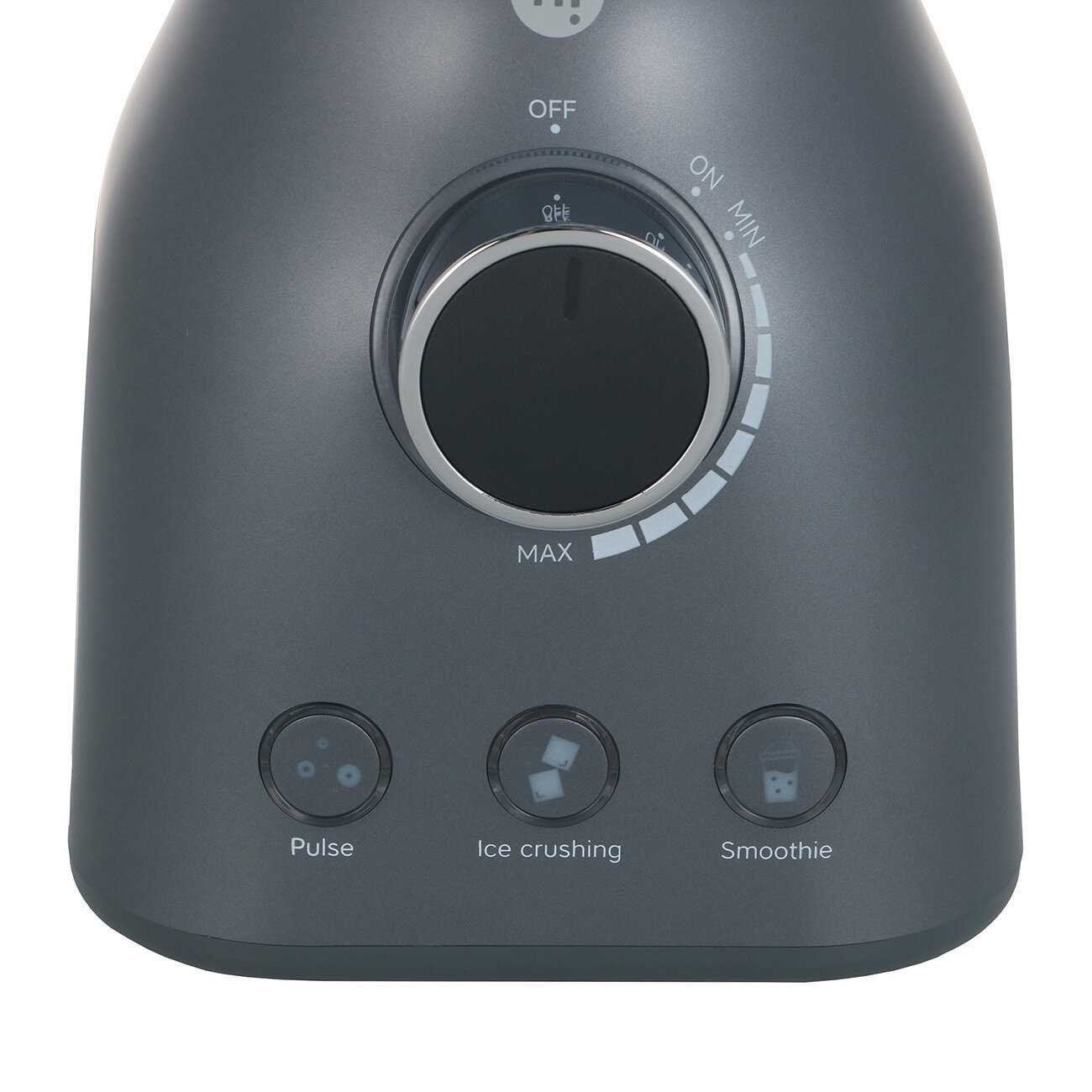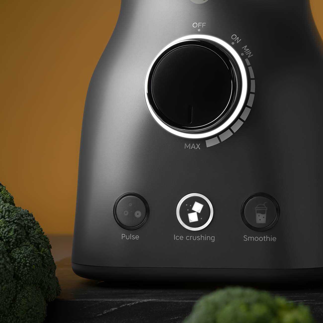 Очень простое и интуитивное: 3 скорости с плавной регулировкой поворотом ручки, плюс автоматические режимы для смузи, льда и импульсный, подсветка кнопок помогает в темноте. Даже дети и подростки справляются с первого раза без инструкции, руки свободны – не нужно держать кнопку.