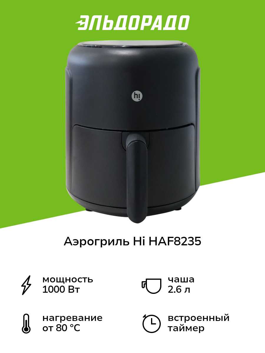 - + Hi HAF8235 нагревается быстро и блюда получаются с хрустящей корочкой без лишнего масла. Удобная панель управления и предустановленные программы экономят время. Корзина легко чистится, корпус компактный — отлично вписывается в кухню.