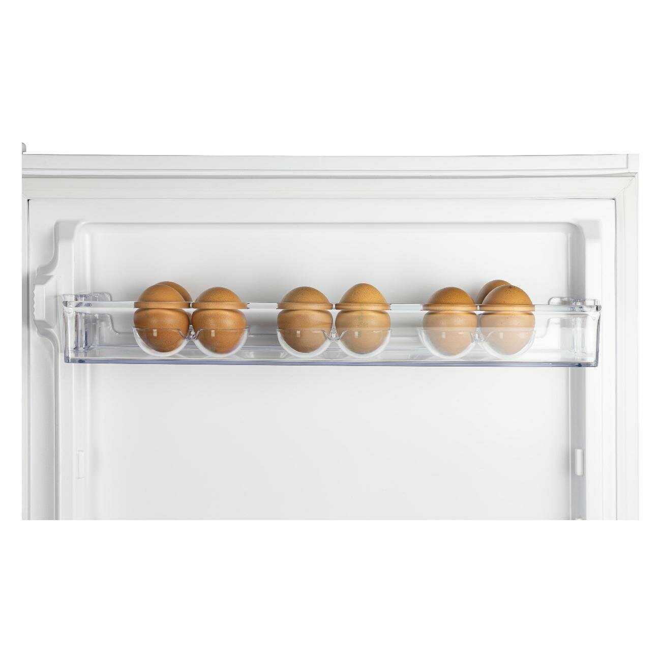 - Лоток для овощей и фруктов плюс полки на дверце с ячейками для 12 яиц оптимизируют пространство, делая холодильник подходящим для дачи или общежития.