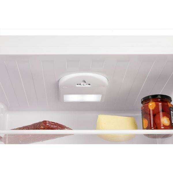 Светодиодная лампа в верхней части холодильной камеры дает равномерное белое освещение без темных зон. Пользователи отмечают достаточную яркость для чтения мелких этикеток даже на нижних полках. Лампа не нагревается и не создает бликов на стеклянных поверхностях. -