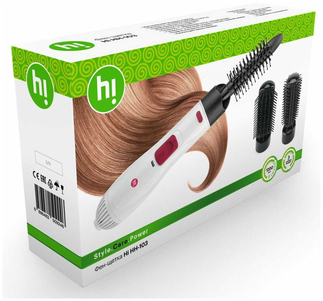 - + Удобный фен щетка. В поездки удобно брать, можно снять насадку и сушить напором горячего воздуха, а после уже с насадкой уложить волосы