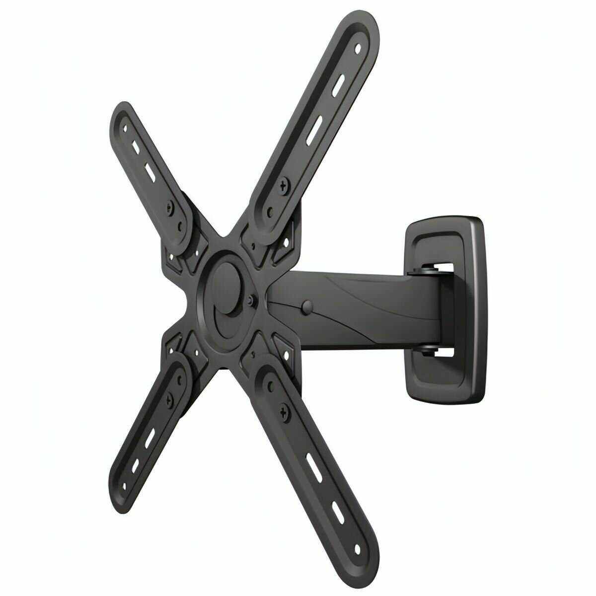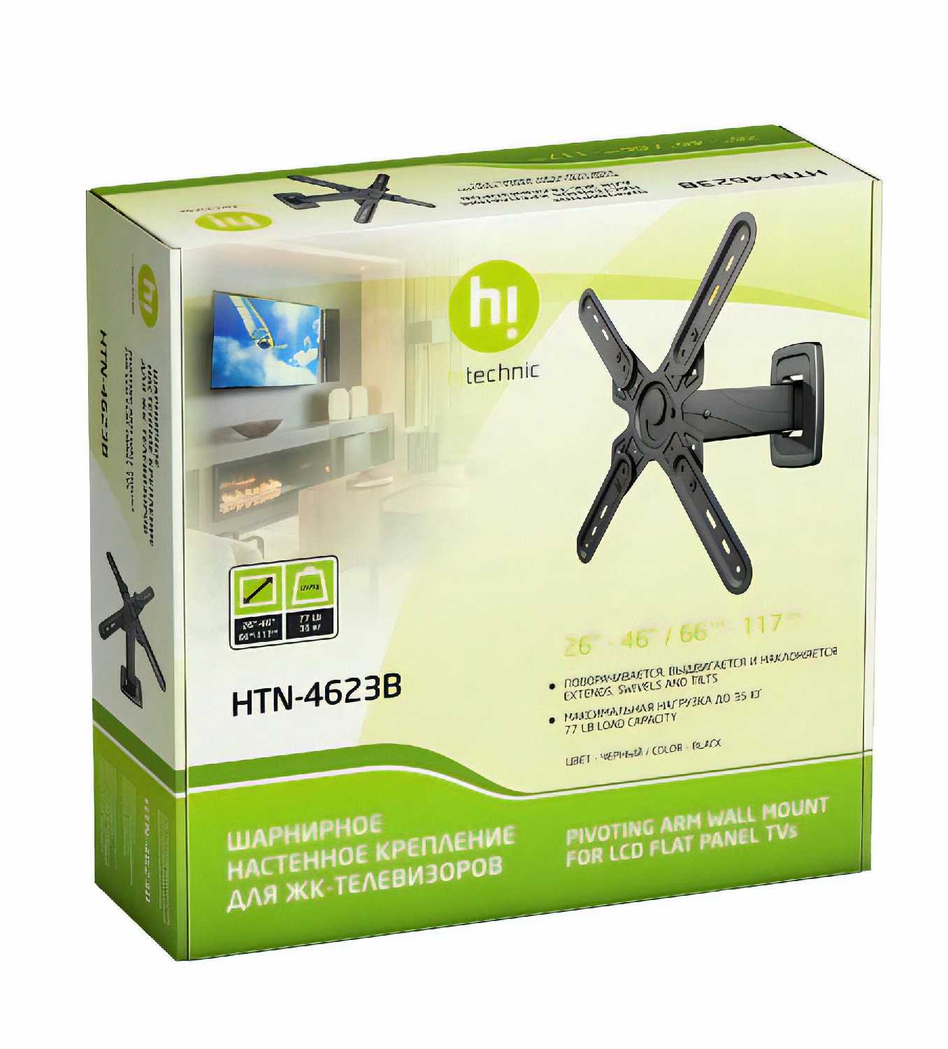 Стандартный кронштейн для телевизора. Он наклонно-поворотный, поэтому весьма удобный. Установка у нас прошла нормально. Как обычно, его нужно вешать на стену. Такой кронштейн рассчитан на телевизоры с диагональю от 66 см и длиннее. Там максимально возможная длина диагонали телевизора может составлять до 115 см. Есть ограничения по весу, там лучше не размещать телевизор тяжелее 32-34 кг.
