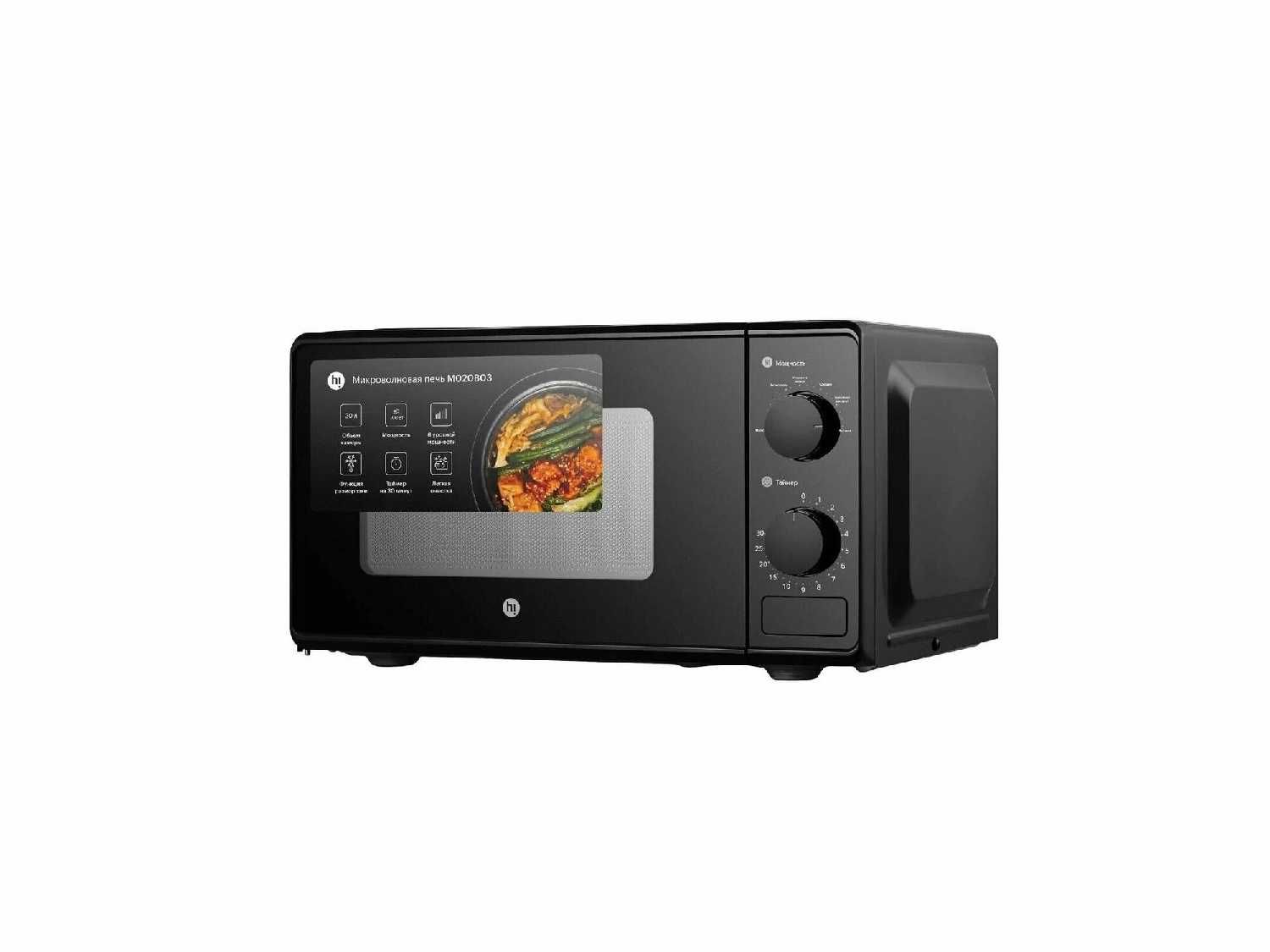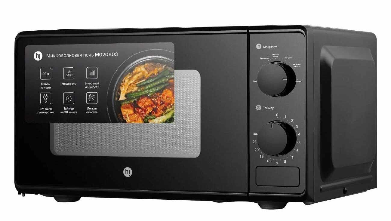 - + Микроволновая печь соло Hi M020B03 черная выглядит очень аккуратно, лаконично и стильно - ничего лишнего. Удобна в пользовании - все опции на поворотных переключателях понятны.