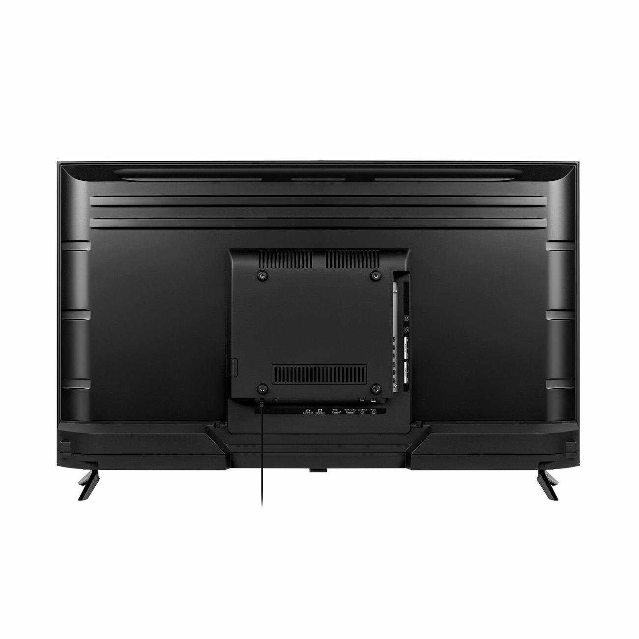 Качество сборки, дизайн и комплектация: Телевизор отличается очень лёгким весом, что, с одной стороны, упрощает настенный монтаж, а с другой — создаёт ощущение хлипкости и ненадёжности при установке на стандартные ножки. Материалы корпуса оцениваются как дешёвый пластик. Пульт дистанционного управления вызывает много нареканий: кнопки тугие и требуют сильного нажатия, отсутствует встроенный микрофон для голосового управления, сам пульт выполнен из некачественных материалов. Внешний вид портит выступающий снизу инфракрасный приёмник. В то же время часть пользователей положительно оценивает современный дизайн с тонкими рамками и лаконичную подставку. Встречаются и откровенные случаи брака на корпусе, такие как слизанные винты и повреждения, полученные при транспортировке. Общее впечатление от сборки соответствует бюджетному сегменту.