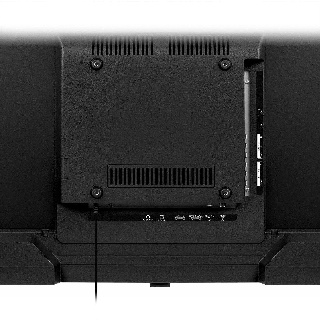 Телевизор имеет современный дизайн с тонкими рамками вокруг экрана, что визуально увеличивает полезную площадь изображения. Он комплектуется двумя вариантами ножек для установки на тумбу, но их устойчивость вызывает вопросы. Благодаря малому весу, модель легко монтируется на стену с помощью универсального кронштейна. -