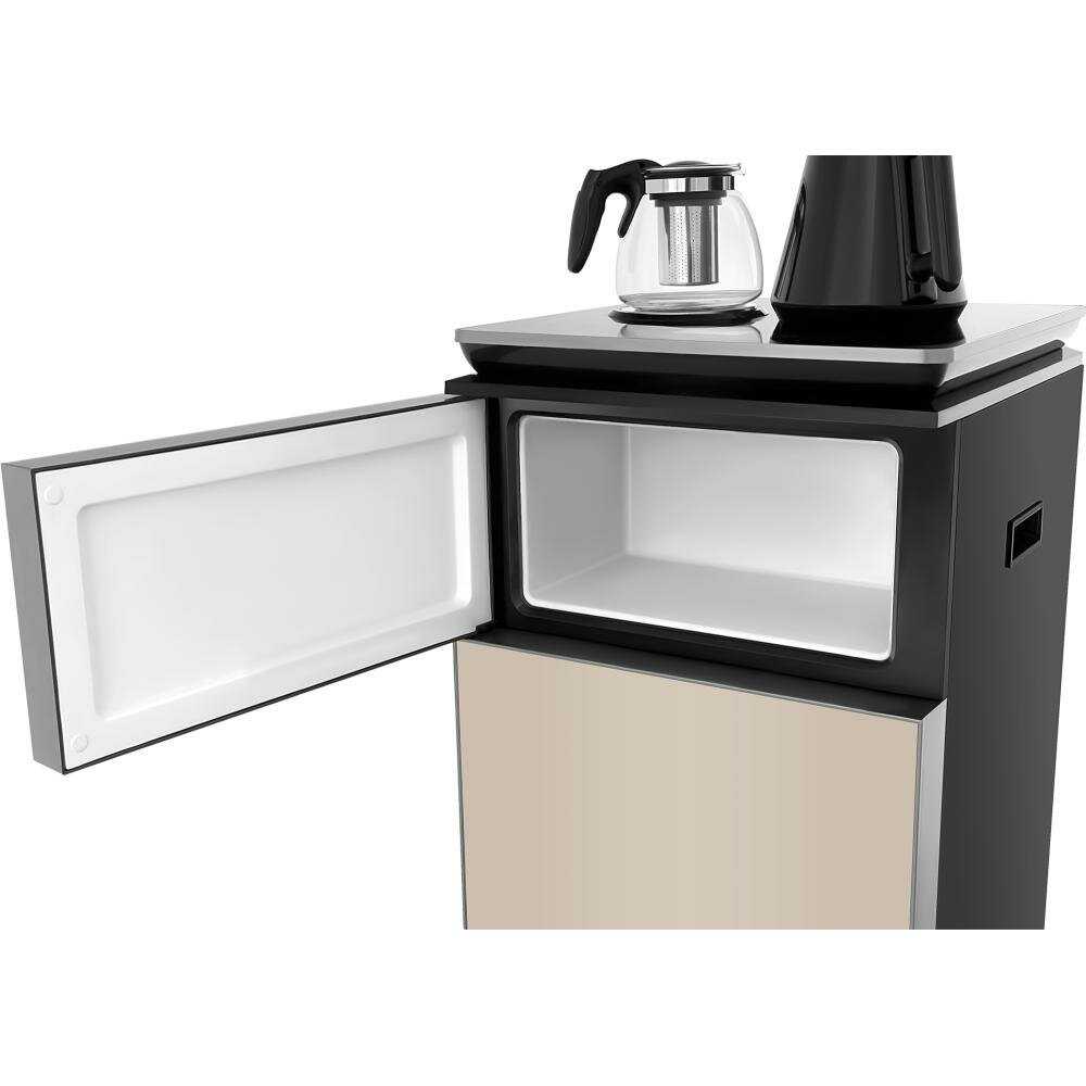 Покупали данный кулер с целью спрятать бутыль. Понравился дизайн, компактность, функции: хорошо охлаждает, не шумный, шустрый, сенсор чувствительный и быстро отзывается, воду кипятит тоже быстро, хотелось бы только объема чайника побольше. Месяц уже в деле, отлично вписался в дизайн кухни.