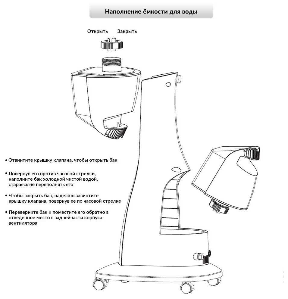 - + работает. как вентилятор, так и увлажнитель. резервуар для воды легко снимается, без каких либо дополнительных манипуляций. есть пульт