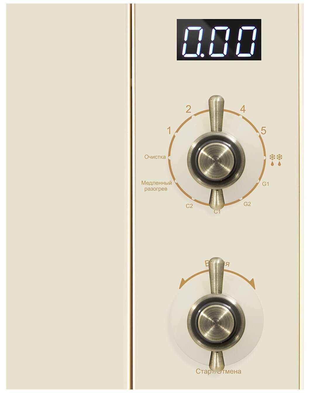 Компактная, легкая, лучший вариант, если нужно вписать в небольшой спейс. При этом не является встраиваемой, имейте в виду - нужна вентиляция. Очень стильно выглядит, в кухни в стиле прованс или ретро вписывается идеально. Цвет - бежевое стекло. Именно стекло, а не пластик. Бежевая, а не слоновая кость. Мне нравится, что ручки нет навесной - экономит пространство. Открывается поддеванием за нижний край дверцы - ничего лишнего. Диаметр поддона 24,5 (здесь почему-то в описании нет, а характеристика важная) - большая тарелка входит целиком! Есть функция гриля и разморозки (обычной, не авто). Классический крутящийся поддон нагрева из стекла, плюс решетка для гриля в комплекте. Оч удобно, что есть табло со временем нагрева, без него трудновато ориентироваться. Никаких лишних запахов пластика и тд! Всё чисто, аккуратно.