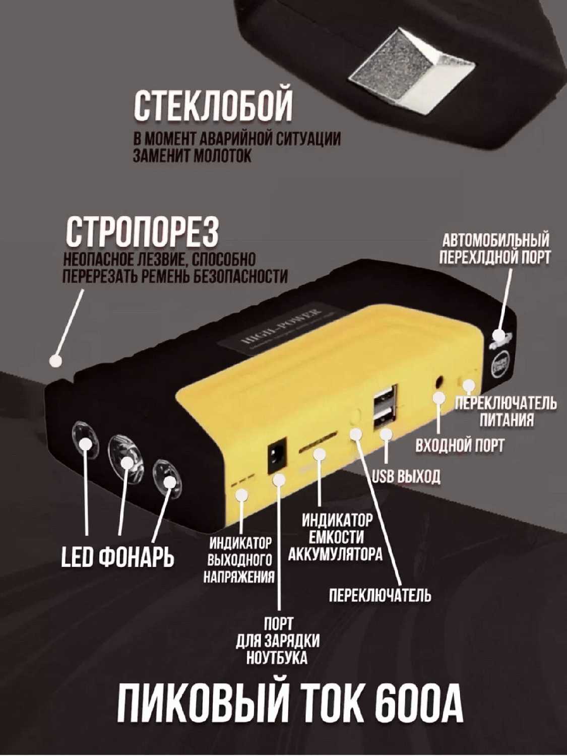 Функции : | автоматическое отключение зарядки, встроенный фонарь, зарядка мобильных устройств (Powerbank), зарядка от прикуривателя, предпусковая зарядка |