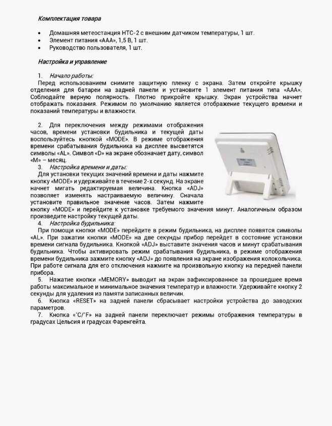 - - Цифры очень бледные. Инструкции в комплекте нет, лежит очень маленькая бумажка, вроде на английском, без хорошей лупы не понять что это. Провод внешнего датчика 1м 46 см вместе с датчиком. Батарейки в комплекте нет. Гарантийный срок 1 мес., хотя по закону, на бытовую технику он должен быть не менее года.