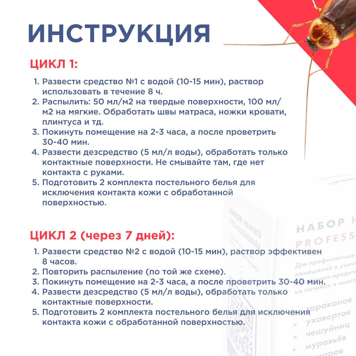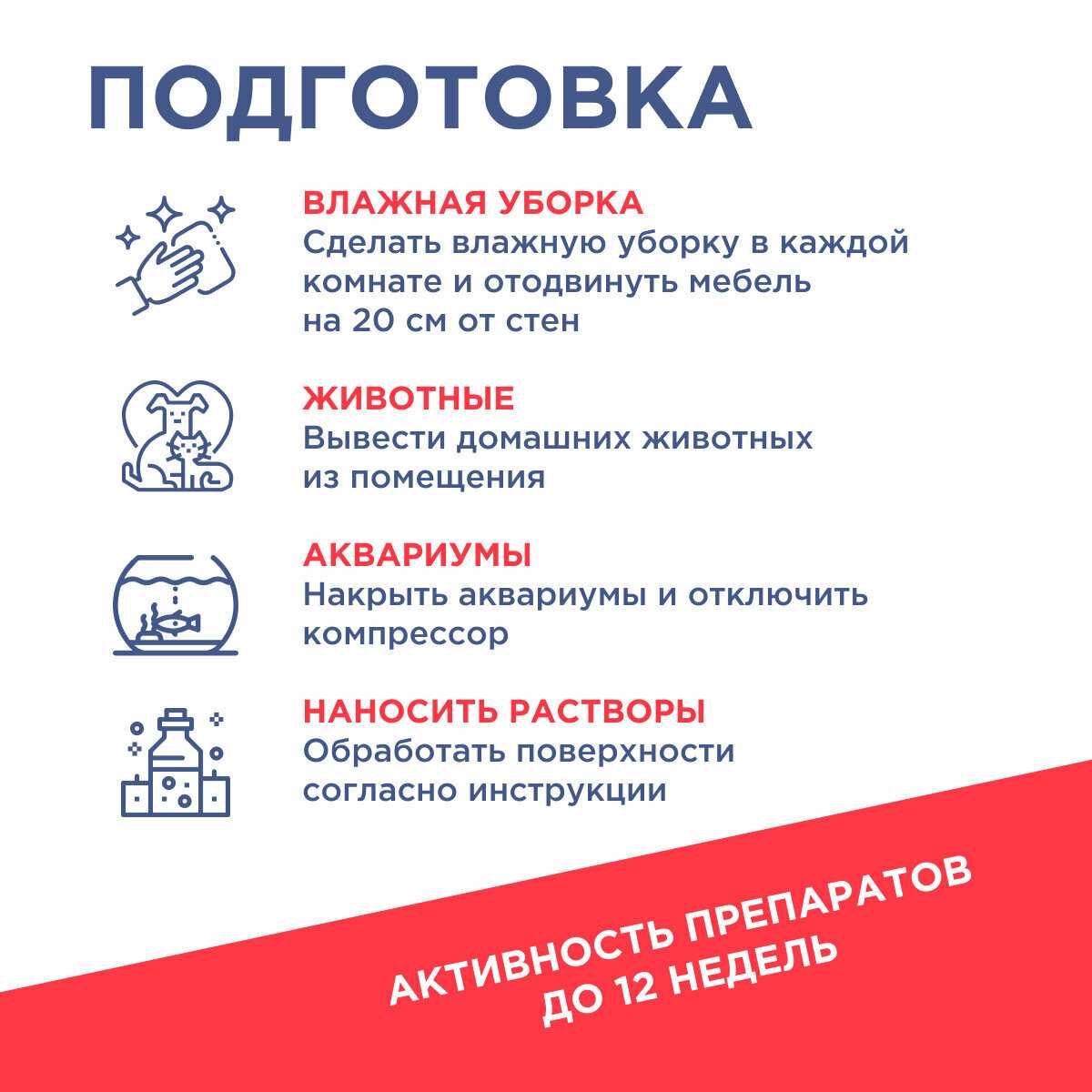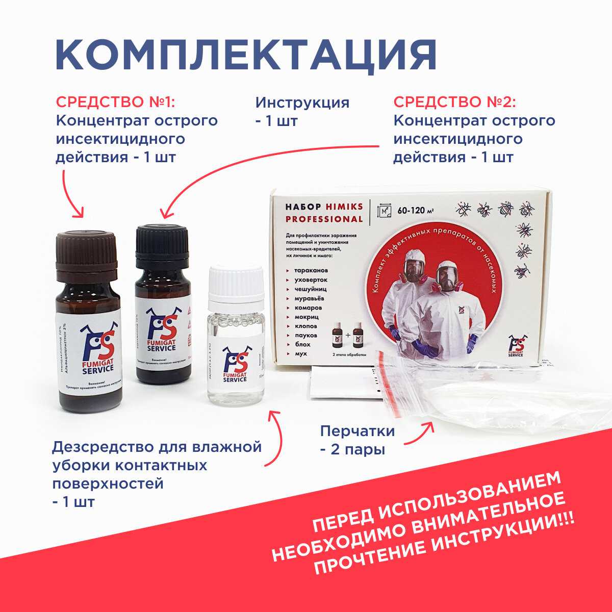 Подробная комплектация : | 2 сертифицированных инсектицидных препарата с минимально допустимым уровнем запаха в герметичной упаковке, - 1 дезинфицирующее средство для постобработки контактных поверхностей, -2 салфетки антисептические спиртовые стерильные, - 1 индивидуальные средства защиты рук (перчатки), - 1 подробная инструкция по применению и мерам безопасности. |
