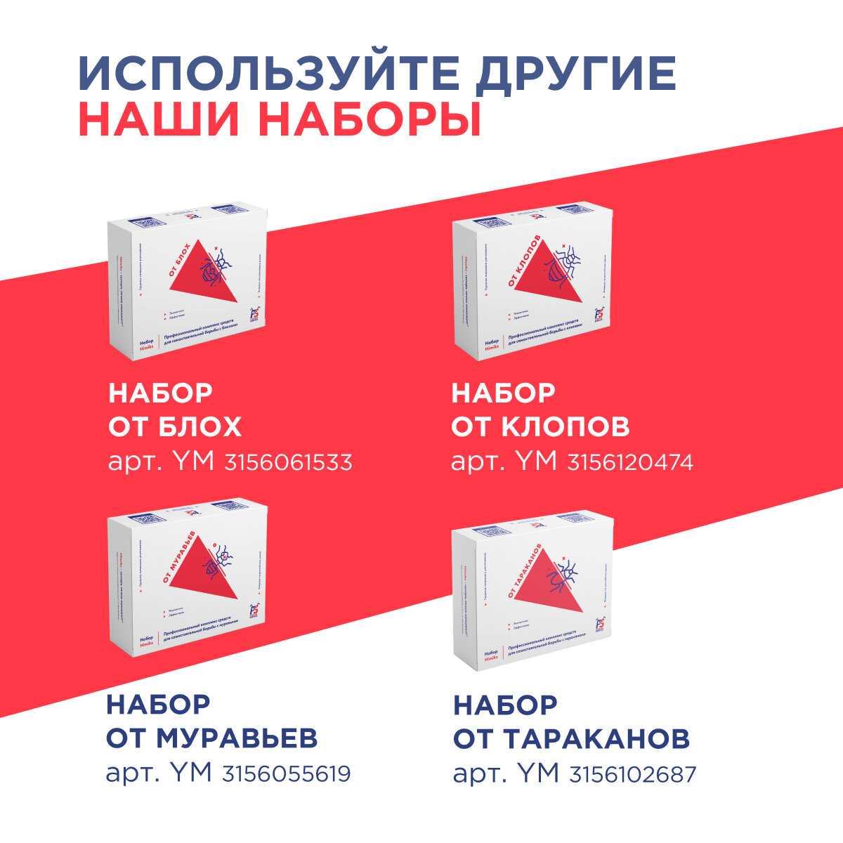 Дополнительная информация : | Использовать строго соглавно инструкции в наборе для достижения максимального эффекта уничтожения насекомых |