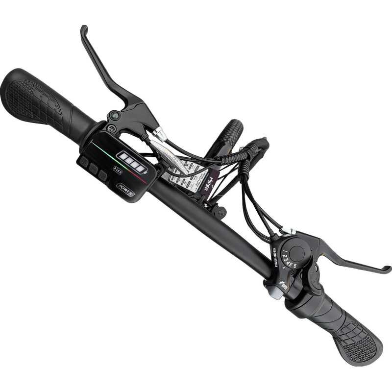 - Задний переключатель Shimano с 7 звездами позволяет выбрать передачу для оптимального каденса 60-80 об/мин, снижая нагрузку на ноги при подъемах до 15% и повышая эффективность педалирования на грунте.