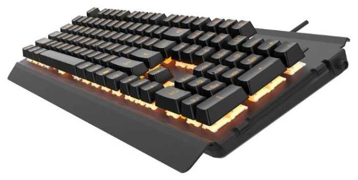 - + Приятные нажатия, много функций через клавишу Fn, шнур в оплетке, какая-никакая подсветка, регулятор яркости подсветки. Железная подставка, хоть и царапает стол, но добавляет клавиатуре веса, что не позволяет ей по этому столу сильно елозить в процессе работы.