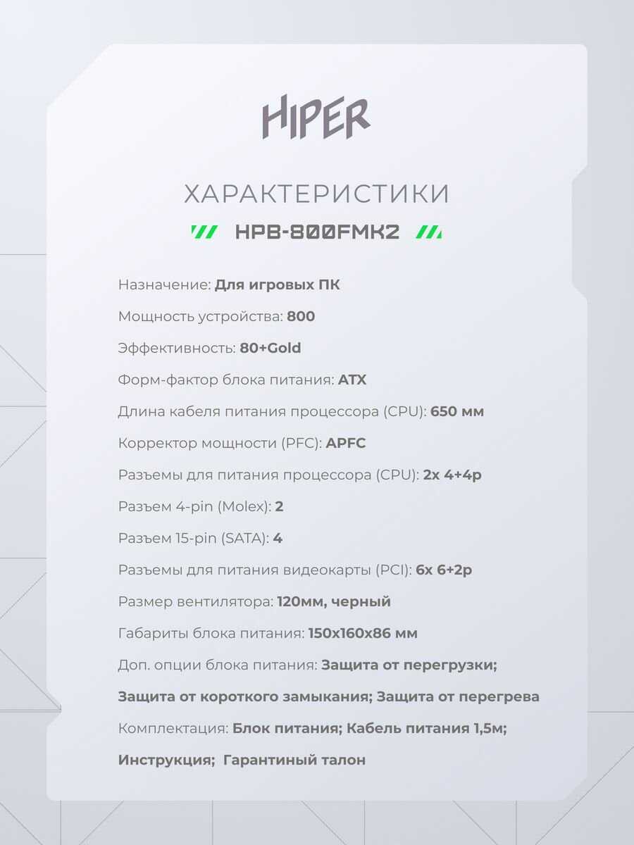 Характеристи HIPER HPB-800FMK2 (800Вт)