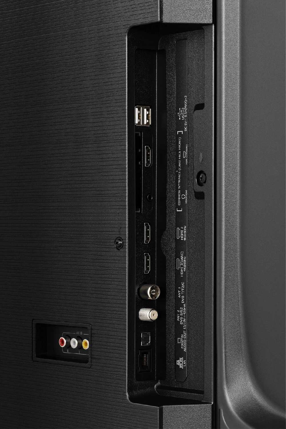 Телевизор использует нестандартное крепление VESA 400x200 мм, что требует специализированных кронштейнов (например, Omnimount OC100F). Разъёмы расположены в центральной части задней панели, что осложняет доступ при плотном прилегании к стене. Рекомендуется использование угловых сетевых вилок или USB-удлинителей для скрытого монтажа. -