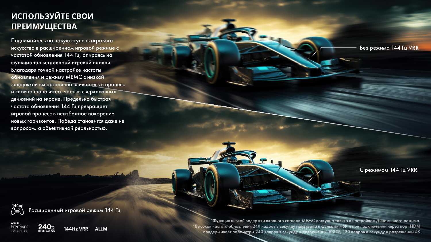 - Режим VRR синхронизирует частоту кадров с консолями (PS5, Xbox) для плавного геймплея.
