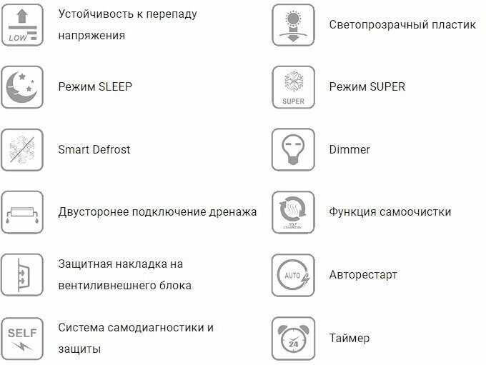 | Дополнительные функции : | Follow me, автоперезапуск, ионизация, разморозка внешнего блока, самодиагностика, самоочистка внутреннего блока, система против образования льда, теплый пуск |