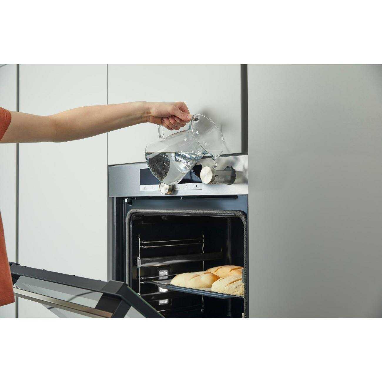 - + равномерная выпечка, паровая очистка, холодная дверца, стильный внешний вид