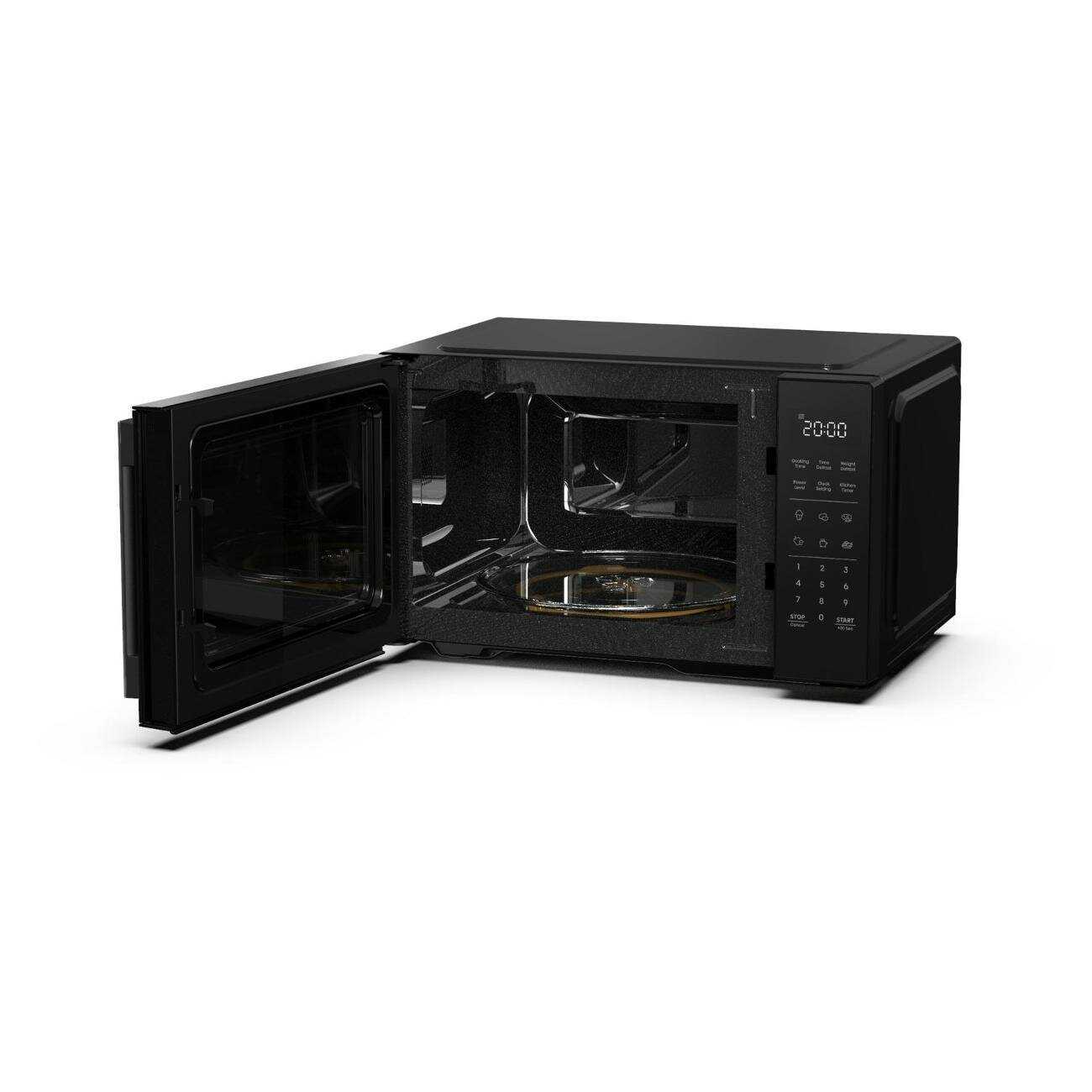 Объём камеры составляет 23 литра, что оптимально для разогрева порций на 2-3 человек или детских завтраков. Поворотный столик диаметром 26 см вмещает крупные тарелки и блюда, обеспечивая равномерное вращение. Пользователи подтверждают удобство размещения посуды для ежедневных задач. Однако для больших семей объём может быть недостаточным. -