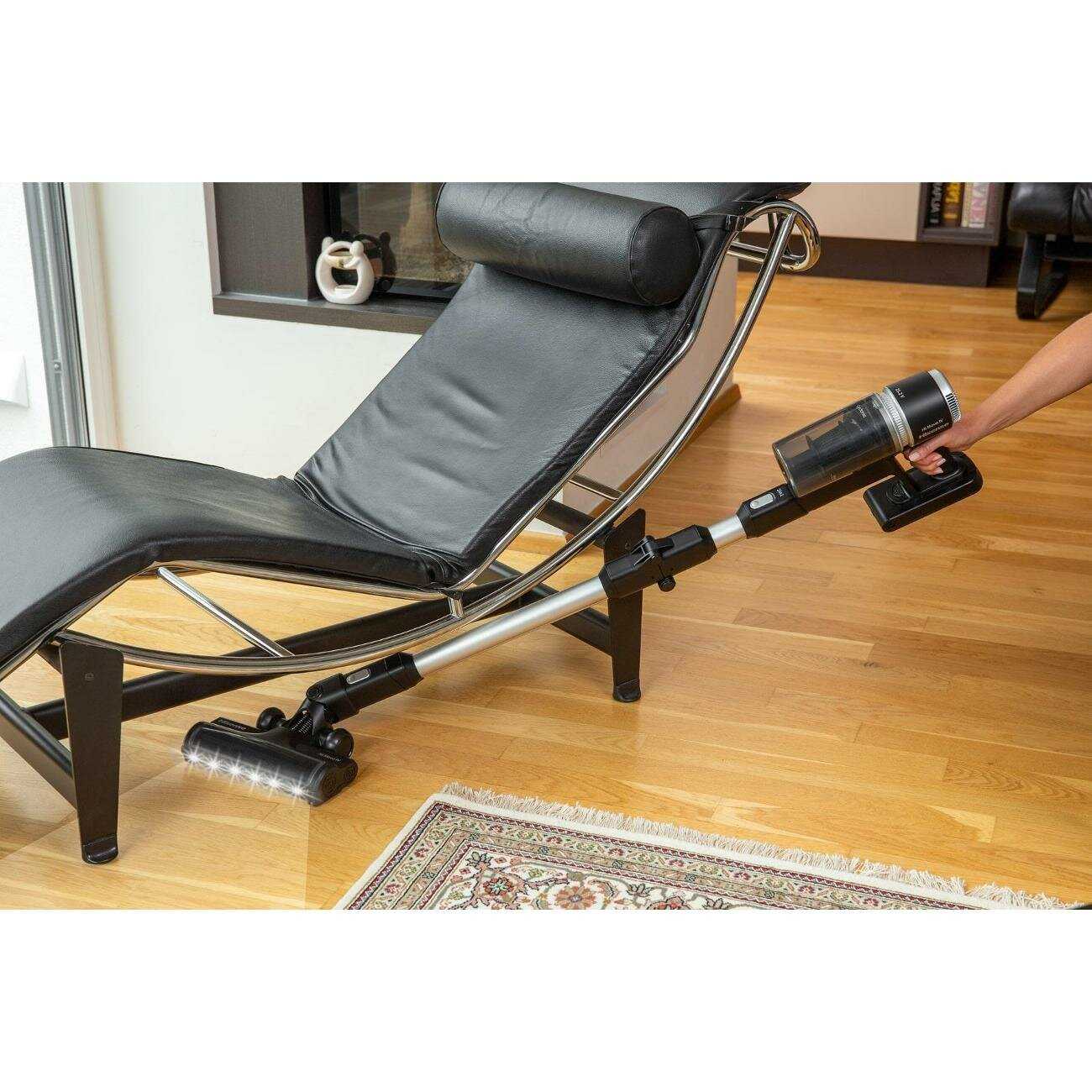 - Подсветка на щетке улучшает видимость пыли и мусора