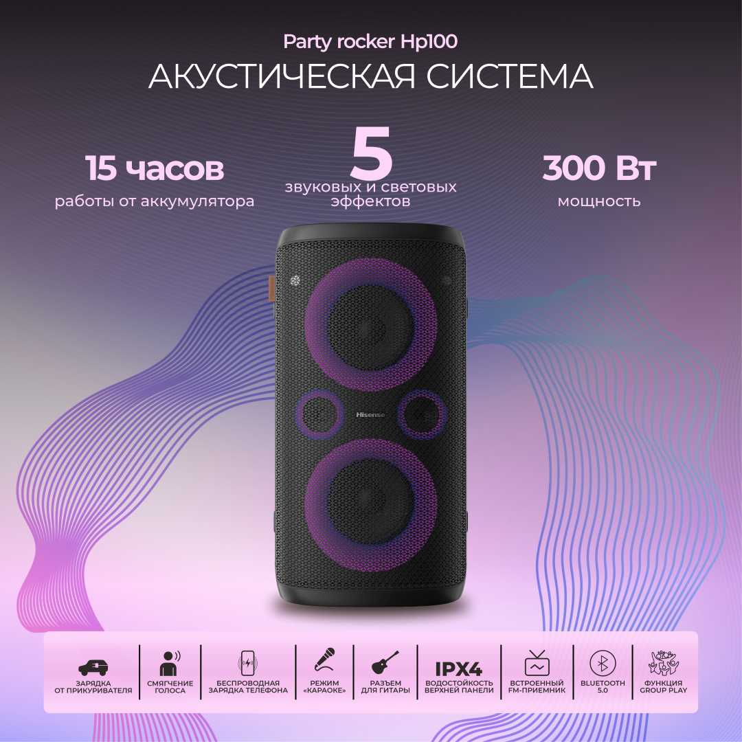 | Особенности : | беспроводное подключение, возможность установки вне помещения, встроенный сабвуфер, караоке |