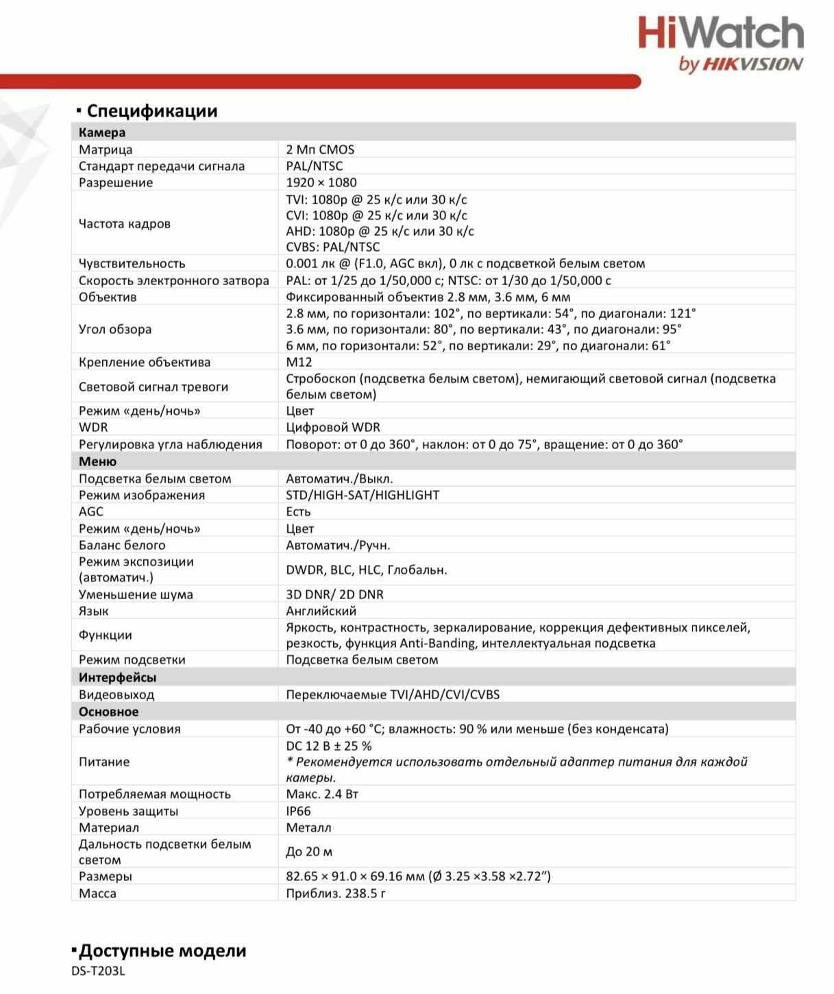 Характеристи HiWatch DS-T203L (2.8mm)