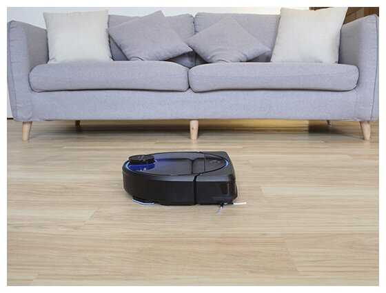 - Прямая передняя грань обеспечивает подход вплотную к плинтусам: робот убирает 98% площади углов, в отличие от круглых аналогов.
