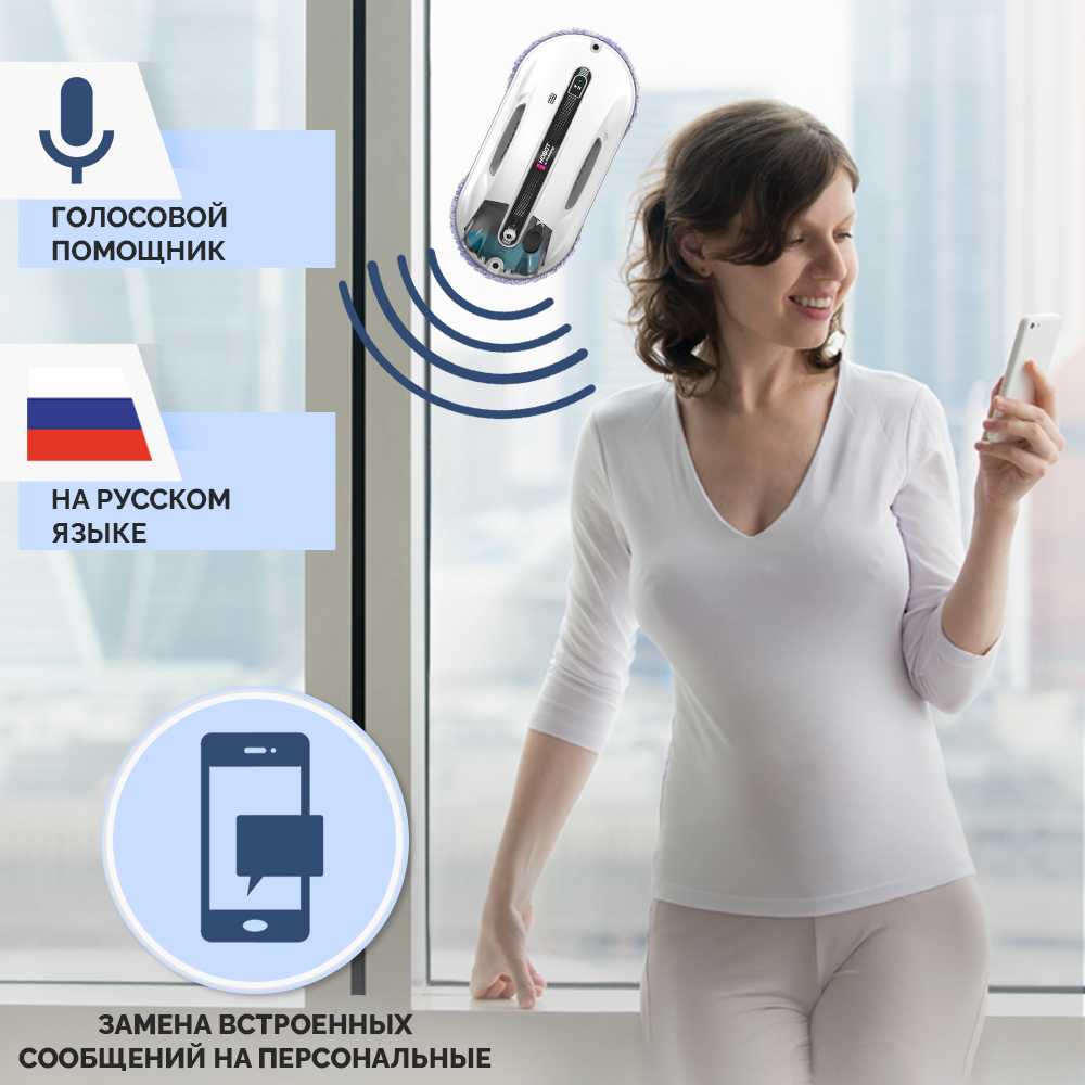 Приложение для смартфона упрощает контроль, но имеет недостатки: виртуальные кнопки не меняют цвет при активации, из-за чего сложно определить текущий режим работы. Голосовые оповещения на русском языке частично некорректны — сообщения о необходимости замены салфеток или ошибках иногда воспроизводятся невнятно. Обновления ПО через «облако» частично решают проблемы с навигацией (например, прерывание мойки на середине окна), но не все глюки устранены. Ручное управление через ИК-пульт ограничено: команды срабатывают только при прямом наведении, а Bluetooth-модуль имеет малый радиус действия и плохо проходит через препятствия.