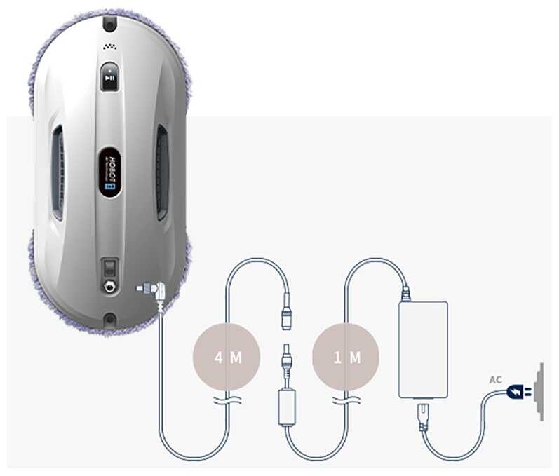 Длина сетевого шнура и страховочного троса (5-6 метров) позволяет обрабатывать окна в больших квартирах без переподключения. Гироскопический сенсор помогает ориентироваться на поверхности, а компактные габариты — мыть узкие створки. -
