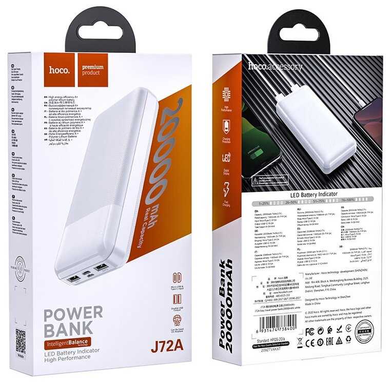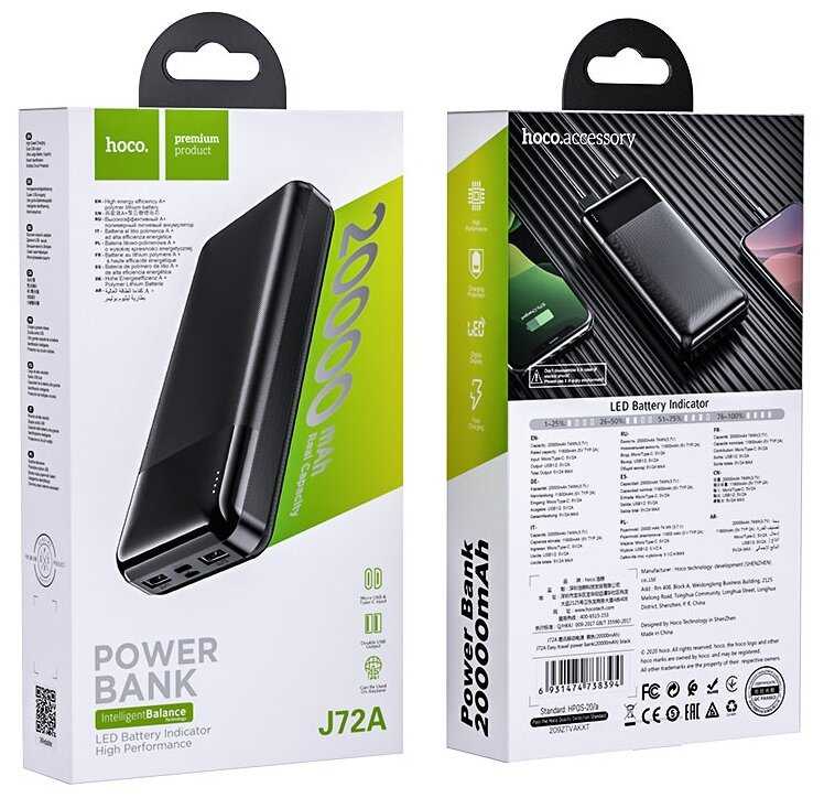 Нормальный не дорогой АКБ HOCO J72A Easy Travel 20000mAh, выбирала по тяжести, очень странно что в разных китайских пауэр банках одинаковой мощности, разный вес. У этого HOCO вес приближен к батарейкам ксиоми, но при этом стоит намного дешевле. Два usb разной мощности, можно заряжать сразу два устройства. Корпус не маркий. В общем однозначно хорошая покупка, надеюсь долго проживет.