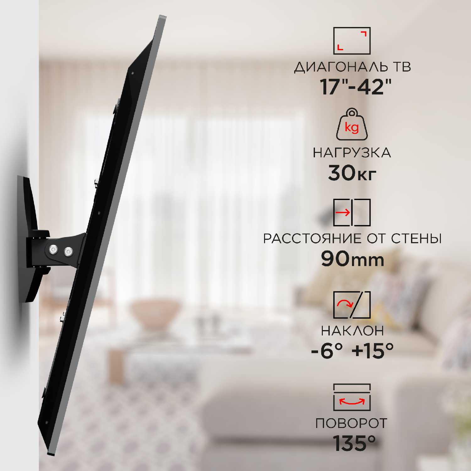 Кронштейн маленький,окуратный, функциию свою выполняет. Кронштейн не выдвигается, только поворачивается на 30%.