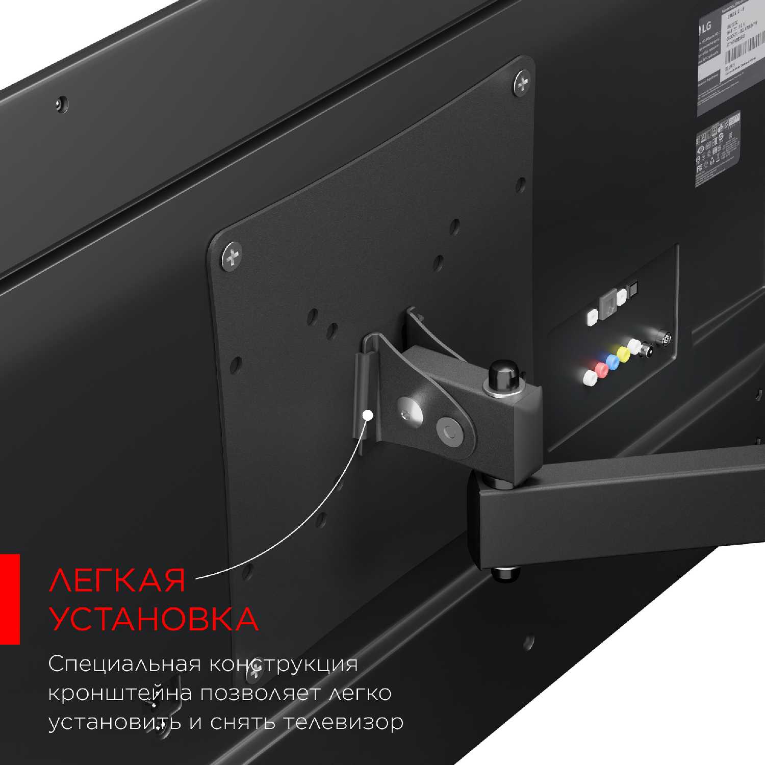 Кронштейн крепится к стене плотно при соблюдении инструкции, поворот из-за габарита телевизора невозможен в полной мере.