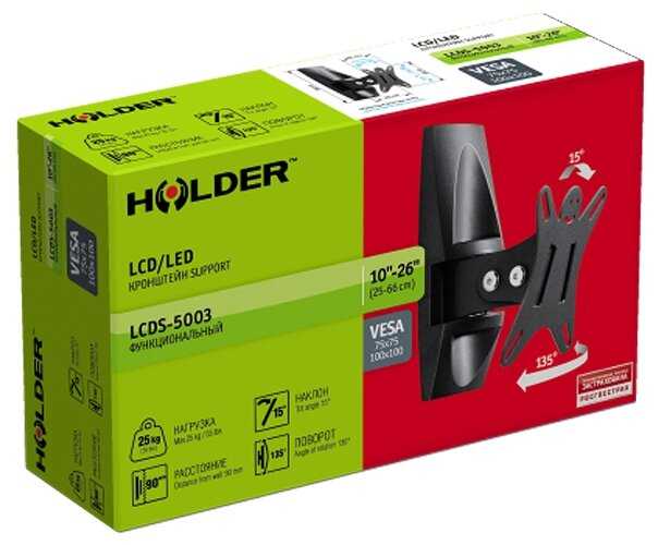 Кронштейн для телевизора Holder LCDS-5003 Black покупала под чёрный 24-дюймовый телевизор на кухню. Кронштейн просто и быстро крепится к стене, обладает поворотно-наклонной системой, достаточно компактный, к стене не впритык, по цене с самовывозом вышло бюджетненько.