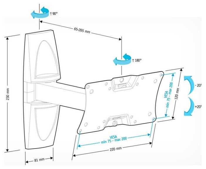 - Поворот влево-вправо на 30-40 градусов, наклон вверх-вниз, вынос от стены до 40 см.