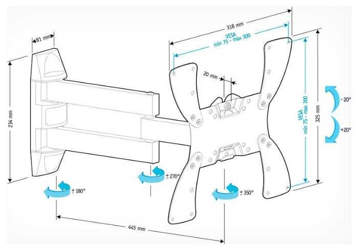 - Поворот на 90 градусов, выдвижение до 45 см от стены, наклон 0–10 градусов.