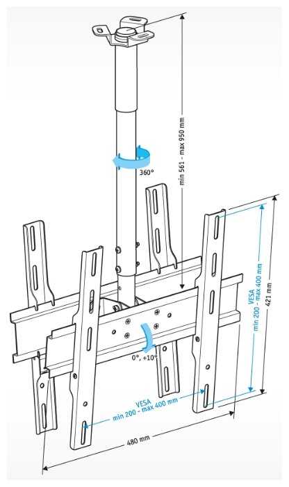 | Дополнительная информация : | расстояние от потолка 561-950 мм, угол наклона 0°, 10°, угол поворота 360° |
