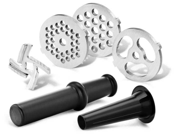Удачная комплектация дисками для фарша (очень мелкая, средняя и для рубленого мяса).