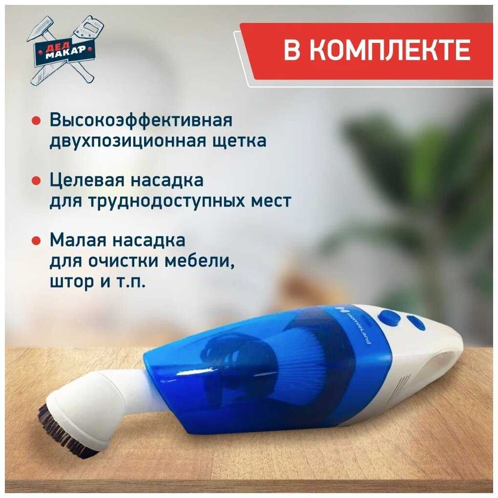 - Три насадки в комплекте (для щелей, мягкой мебели, труднодоступных зон).