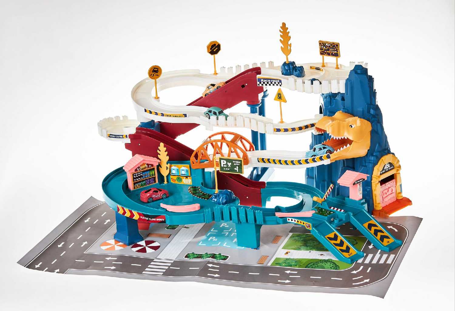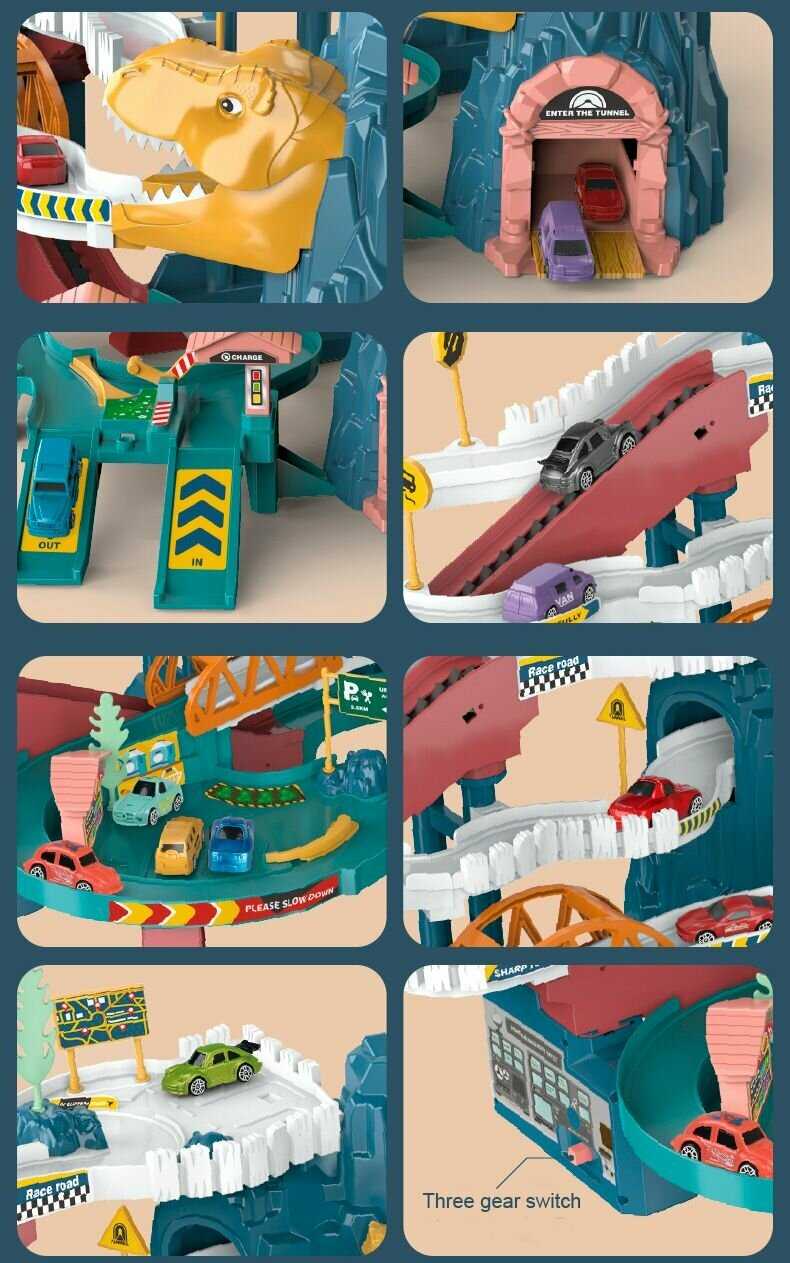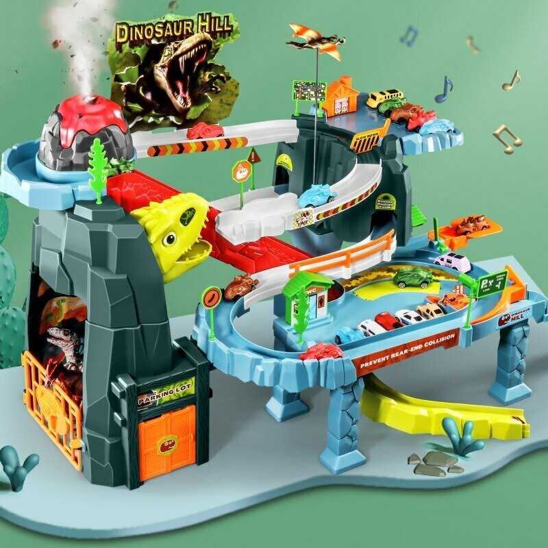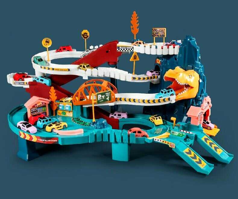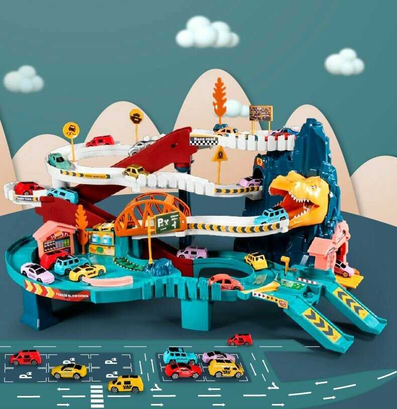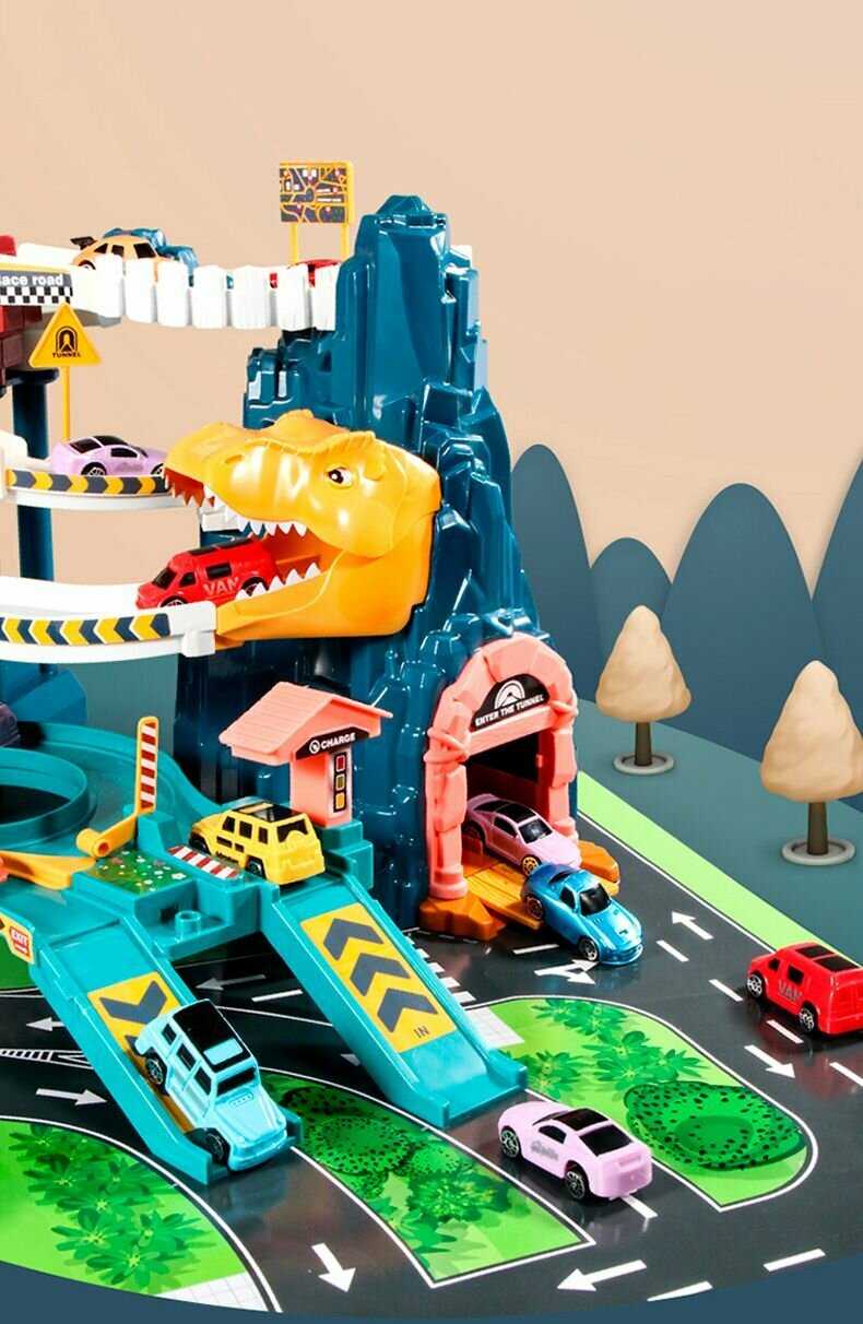 сыновьям очень нравится, в комплекте 8 мини машинок, интересных, сама парковка озвучена, можно включить просто движение трассы, а можно также включить режим где присутствует ещё и звуковое сопровождение, динозаврик на железной палочке крутится, парковка свои функции выполняет все, кроме вулкана.