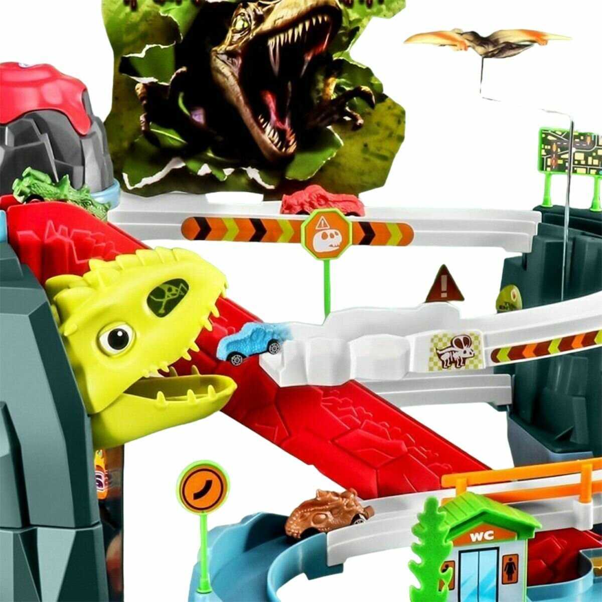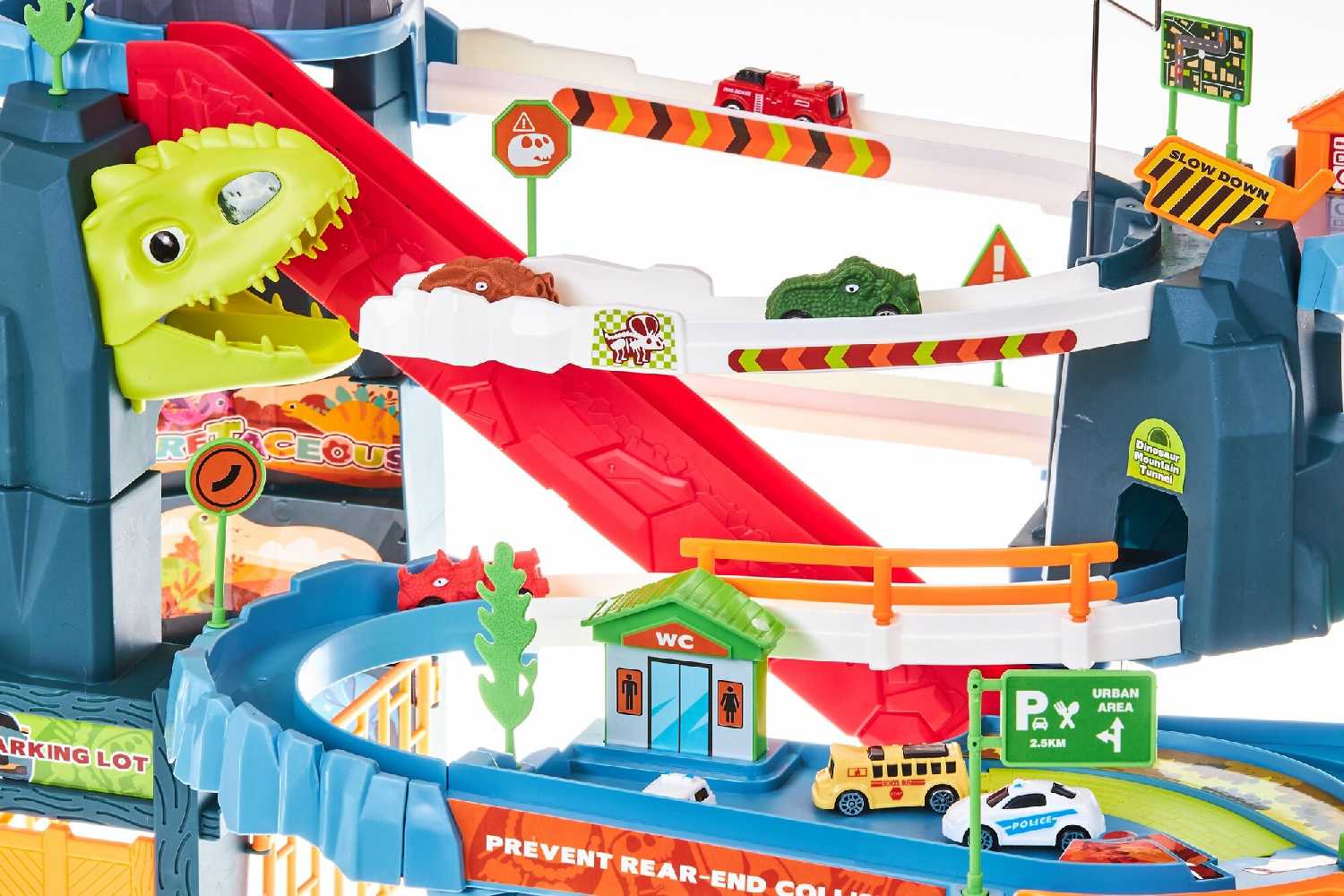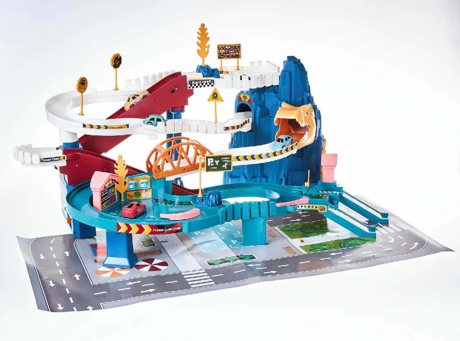 сыновьям очень нравится, в комплекте 8 мини машинок, интересных, сама парковка озвучена, можно включить просто движение трассы, а можно также включить режим где присутствует ещё и звуковое сопровождение, динозаврик на железной палочке крутится, парковка свои функции выполняет все, кроме вулкана.