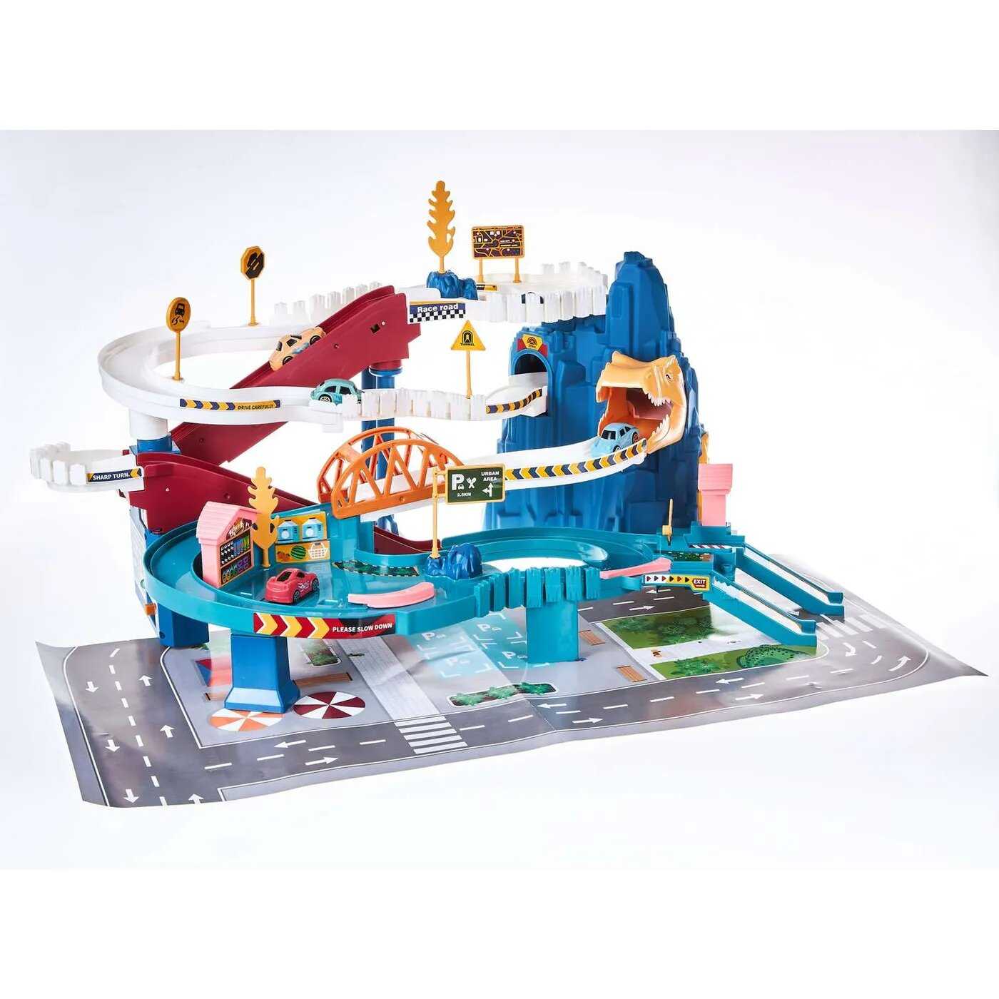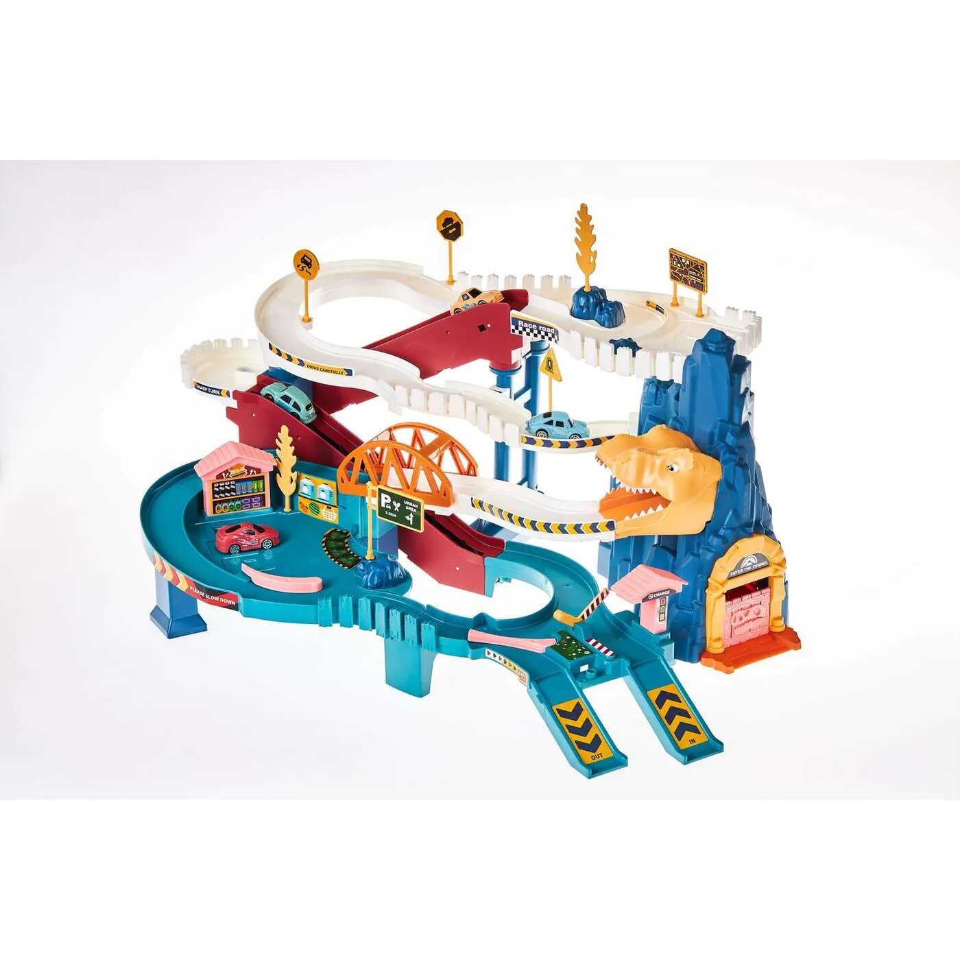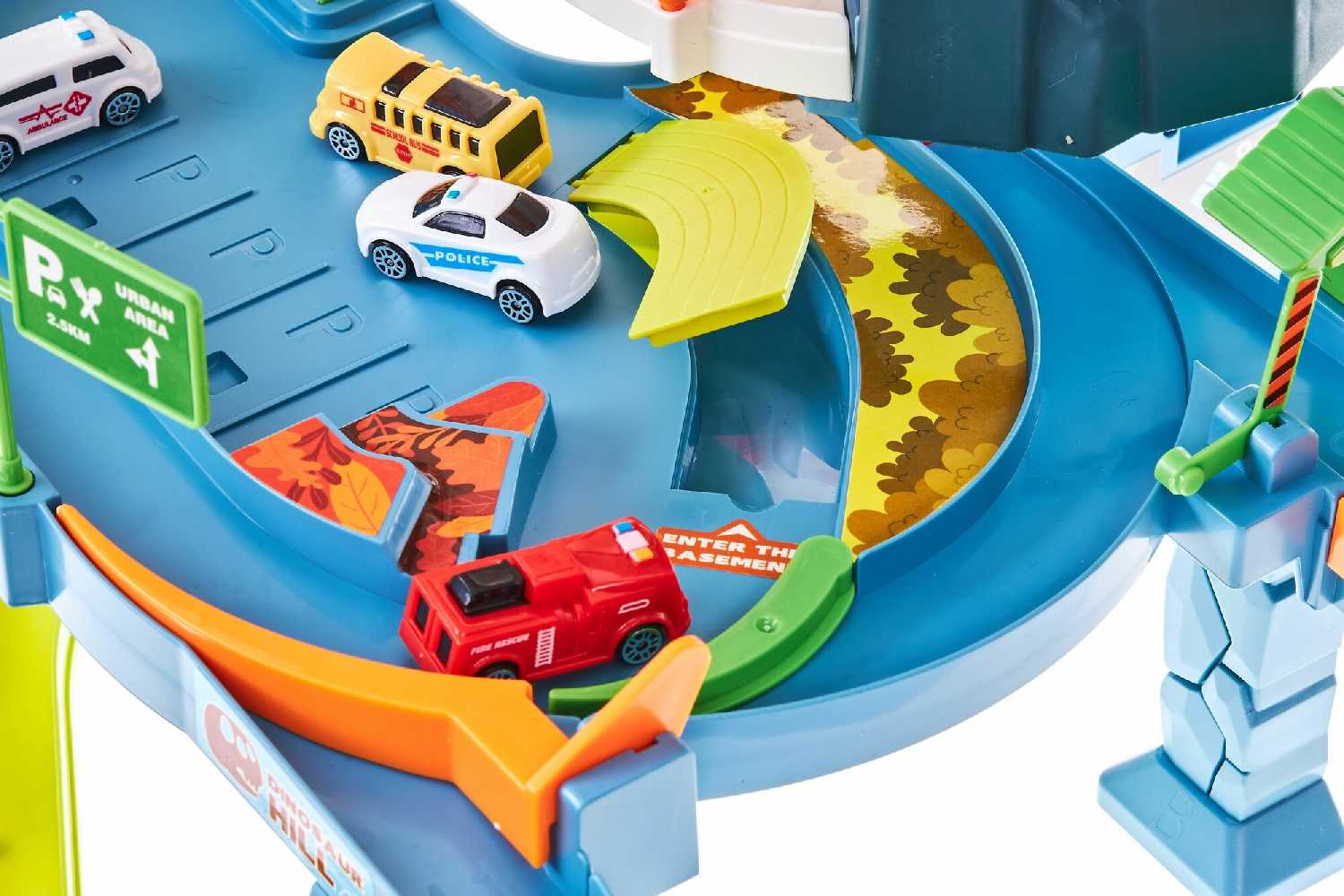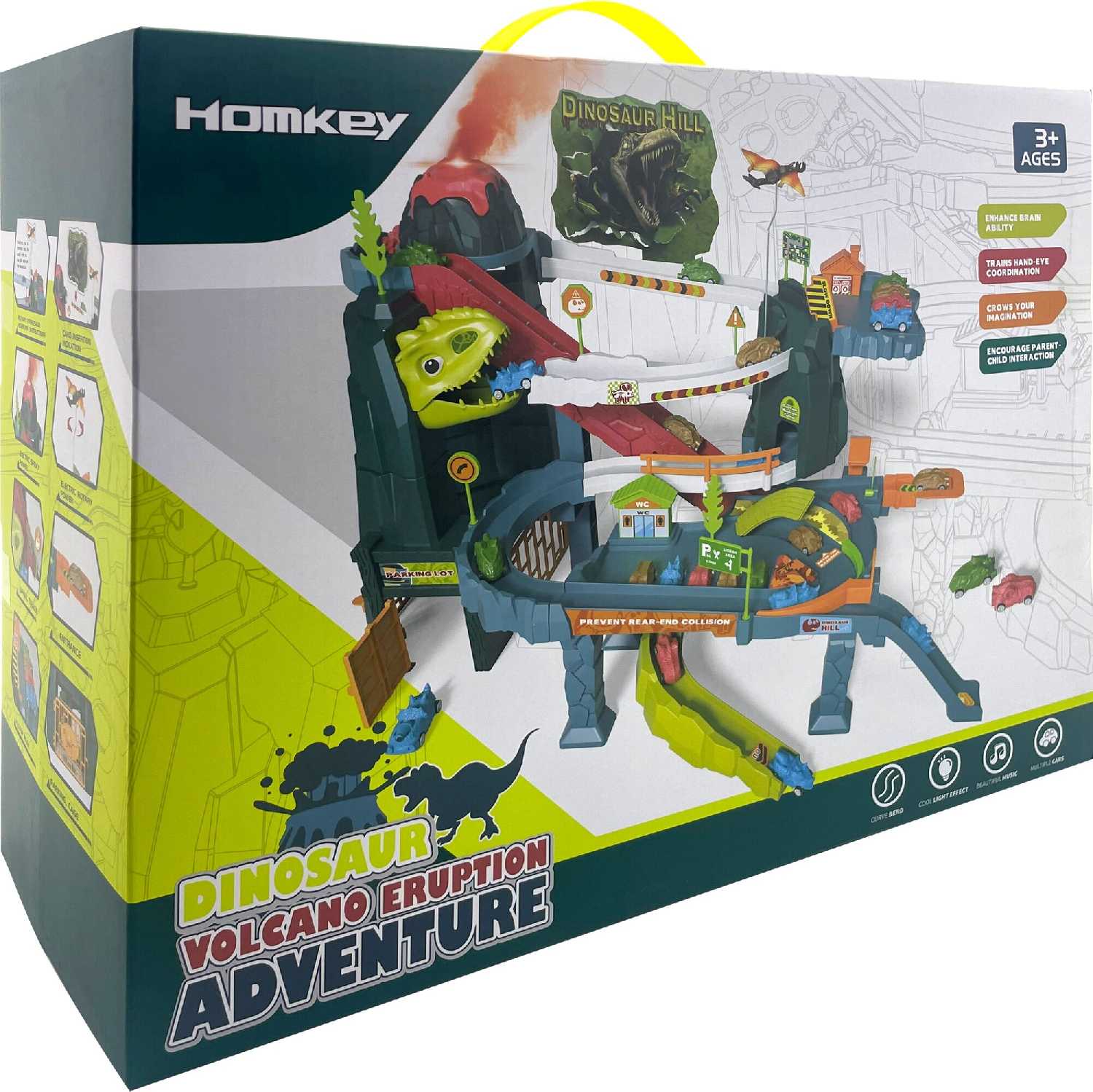 сыновьям очень нравится, в комплекте 8 мини машинок, интересных, сама парковка озвучена, можно включить просто движение трассы, а можно также включить режим где присутствует ещё и звуковое сопровождение, динозаврик на железной палочке крутится, парковка свои функции выполняет все, кроме вулкана.