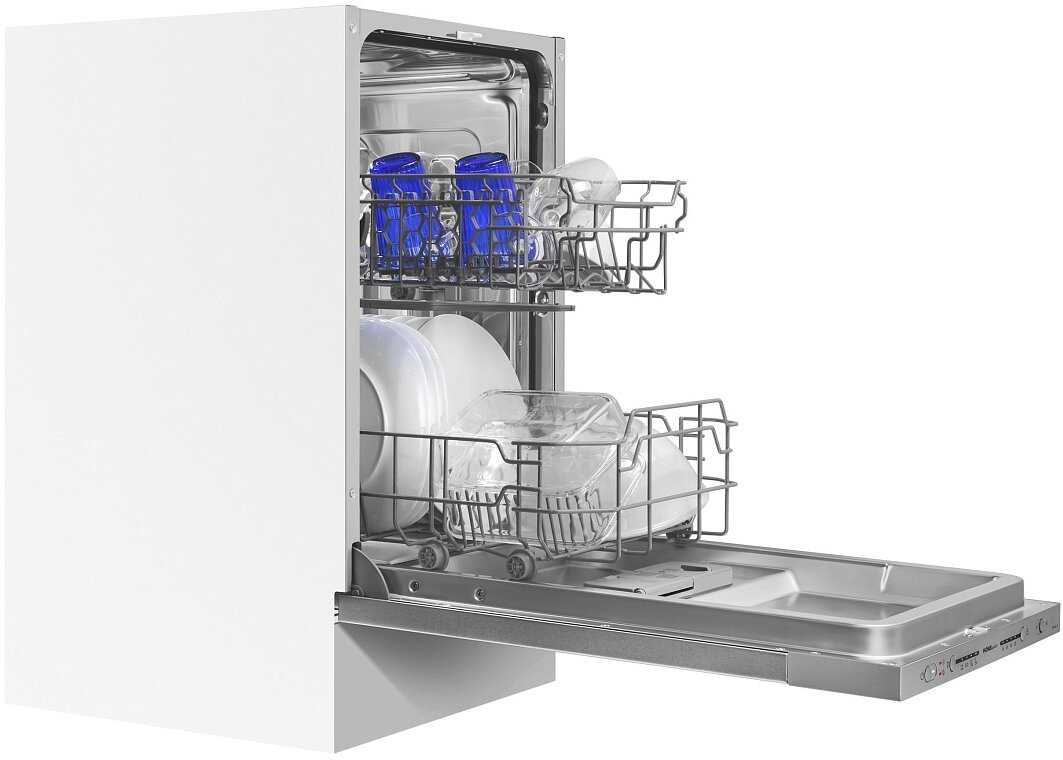 При ширине 45 см модель удивила многих своей вместительностью: владельцы успешно загружают несколько комплектов посуды, включая крупные кастрюли и сковородки (при условии их компактного размещения). Для пары или семьи с детьми объема хватает, хотя накопление грязной посуды до полной загрузки может занимать 1-2 дня. Верхний ярус особенно удобен для столовых приборов и мелких предметов, но нижняя корзина при полной загрузке иногда оставляет посуду влажной после сушки. -