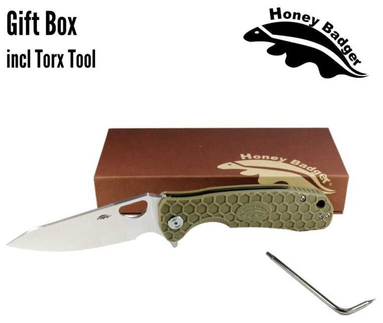 - + Отличный EDC нож .Легкий, простой, функциональный, с удобной клипсой.Также радует и комплектация, с ключом и удобной коробкой. Это мой 5ый Honey Badger