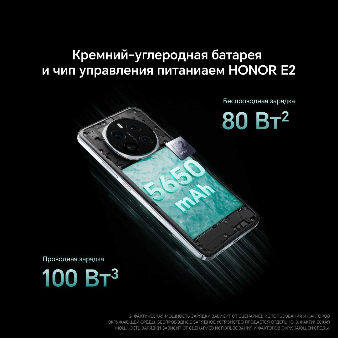 В режиме без игр (соцсети, навигация, фотосъемка) батареи хватает на 1.5–2 дня. При интенсивной нагрузке (игры, 4K-видео) смартфон работает полный день — с 7 утра до позднего вечера. Чип Honor E2 оптимизирует энергопотребление, а система охлаждения предотвращает перегрев. -