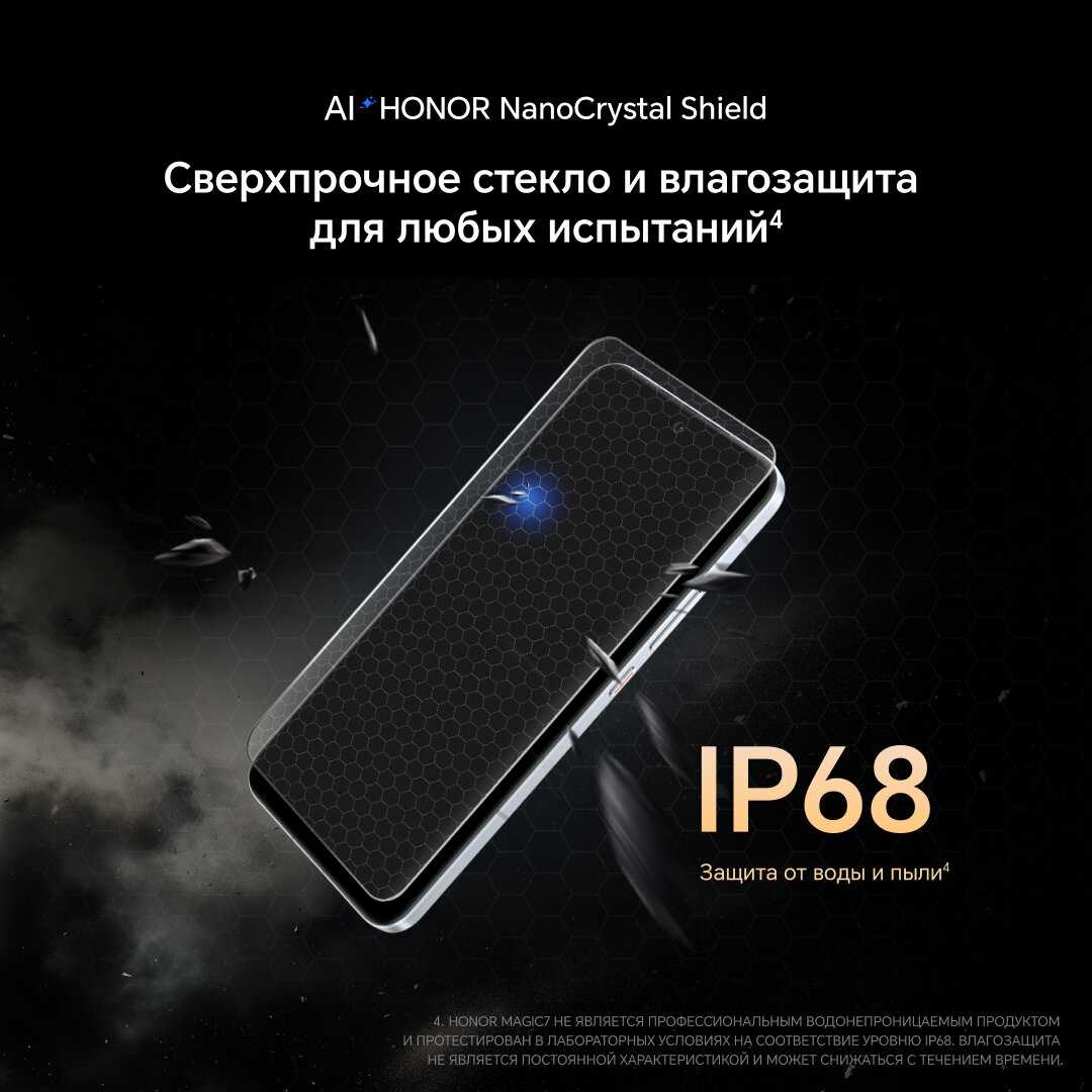 - В приложении всё продумано; экран защищён HONOR NanoCrystal Shield; батарея тянет активное использование; быстрая зарядка 100 Вт — полный цикл за 20 минут. ⚡ - - Батарея хоть и большая по объёму, но при активном использовании всё равно придётся подзаряжать хотя бы раз в сутки.
