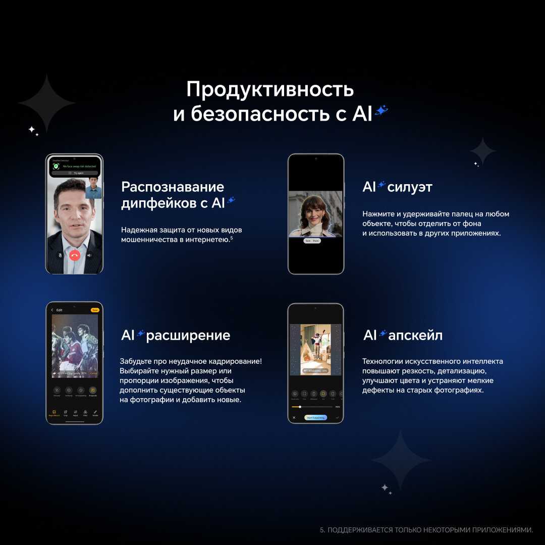 Искусственный интеллект автоматически корректирует портреты: оптимизирует тон кожи, выделяет контуры и усиливает детализацию волос. В режиме макросъемки AI распознаёт объекты и настраивает глубину резкости, а при обработке HDR балансирует экспозицию без пересветов. -